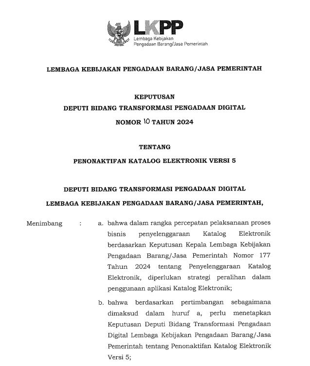 Keputusan Deputi II LKPP Bidang Transformasi Pengadaan Digital Tentang Penonaktifan Katalog Elektronik Versi.5