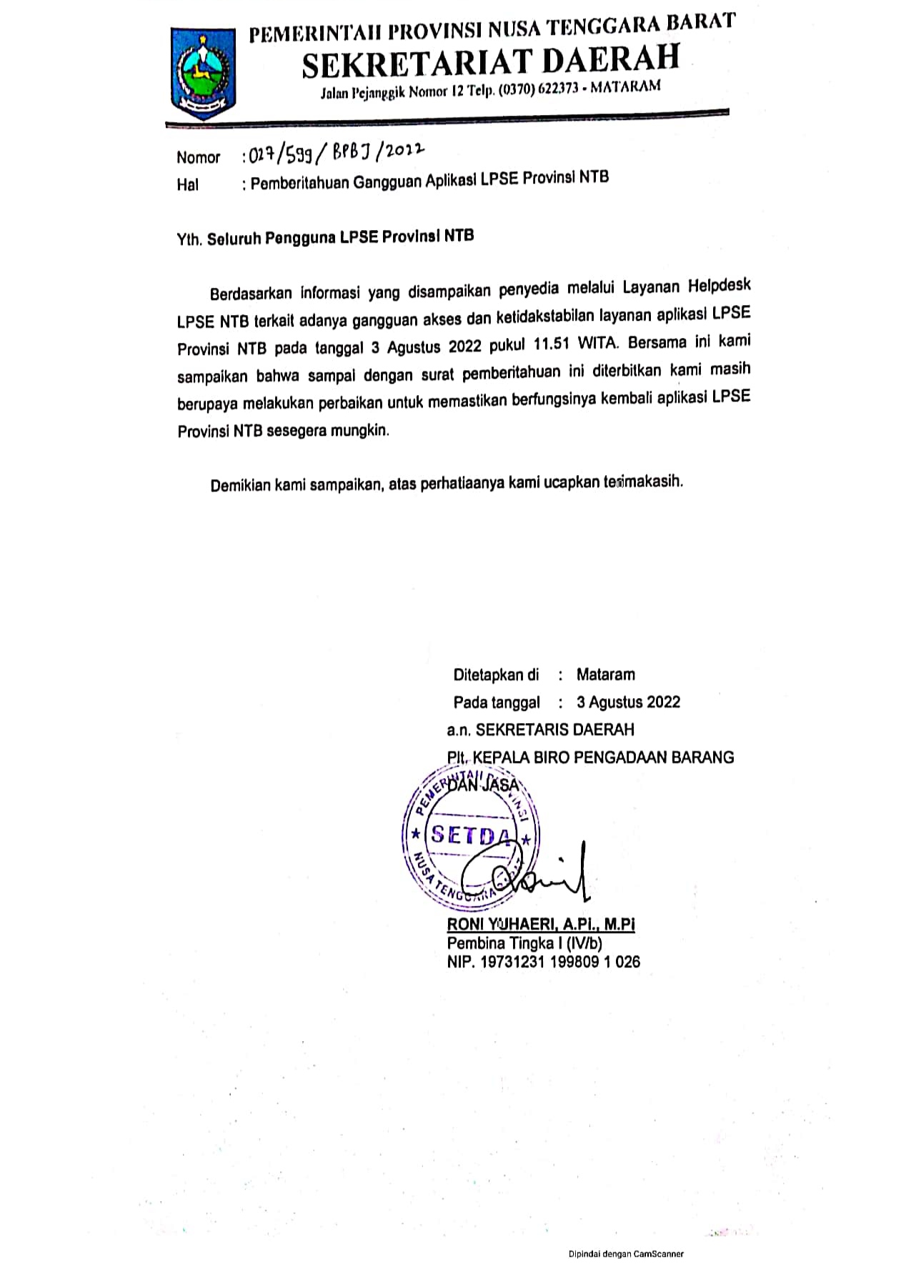 Pemberitahuan Gangguan Aplikasi SPSE Provinsi NTB