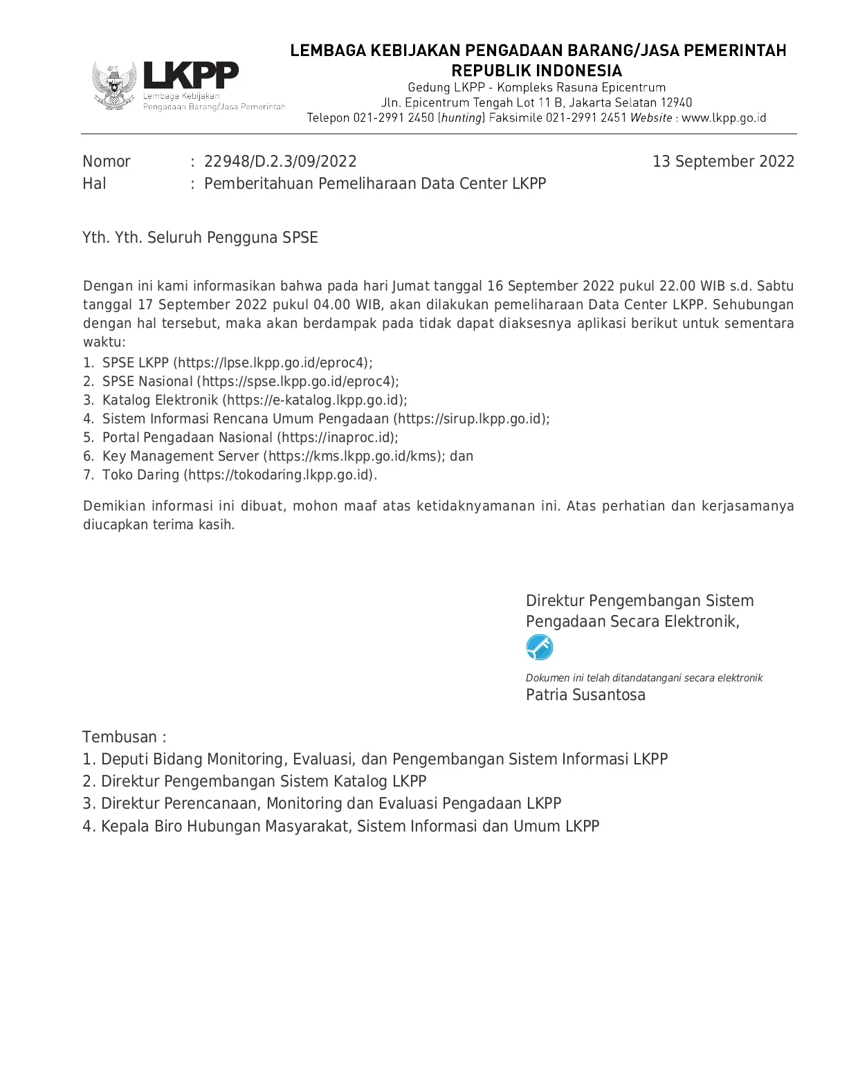 Pemberitahuan Pemeliharaan Data Center LKPP
