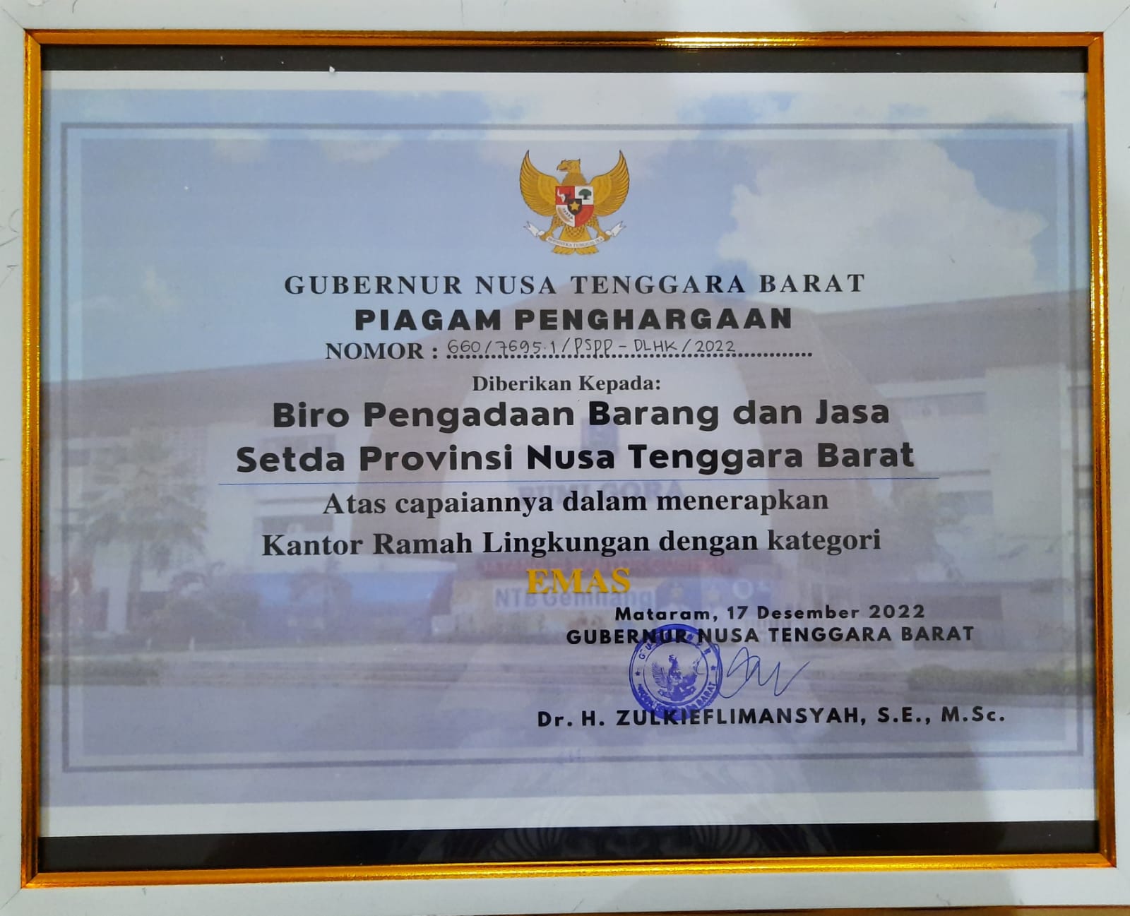 Tahun ini bertepatan dengan HUT Provinsi Nusa Tenggara Barat yang ke-64 Tahun 2022, Biro Pengadaan Barang dan Jasa Setda Provinsi NTB menerima penghargaan atas capaiannya dalam menerapkan Kantor Ramah Lingkungan dengan kategori "EMAS".